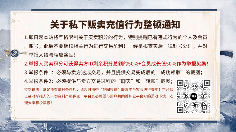 官方禁止1L5会员资格以及积分‘游戏账号’私下倒卖、转让、借用行为,不可兑换现金,请妥善保管,遗失泄露封禁等不做补偿